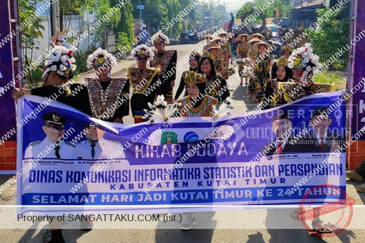 SANGATTAKU – Dinas Komunikasi dan Informatika Statistik dan Persandian (Diskominfo Staper) Kabupaten Kutai Timur (Kutim) turut serta dalam Kirab Budaya untuk merayakan Hari Jadi Kabupaten Kutim yang ke-24. Tim Diskominfo Staper, dipimpin oleh Kepala Bagian Umum dan Kepegawaian, Reza Triakbari, berpartisipasi dengan mengenakan kostum etnik suku Dayak dan menampilkan keberagaman budaya Kabupaten Kutim.