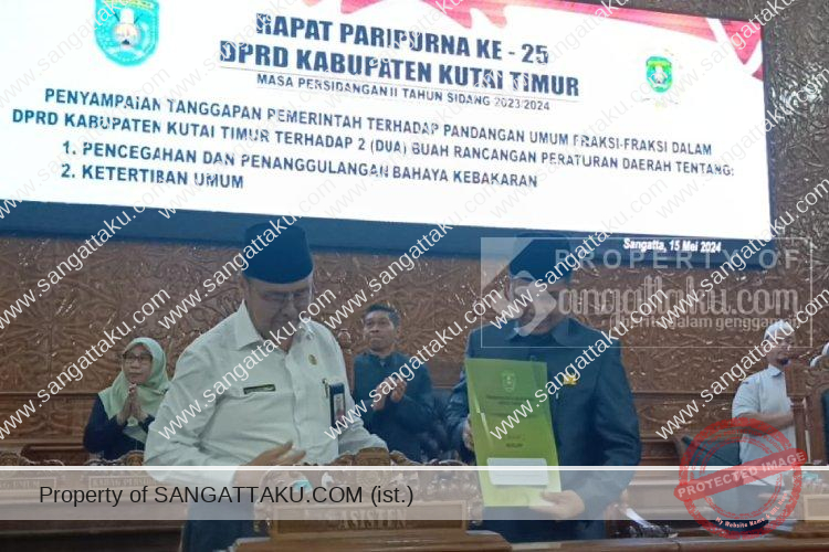 SANGATTAKU – Dewan Perwakilan Rakyat Daerah (DPRD) Kabupaten Kutai Timur (Kutim) menggelar Rapat Paripurna ke-25 untuk menyampaikan tanggapan pemerintah terhadap pemandangan umum fraksi-fraksi DPRD Kutim mengenai dua Rancangan Peraturan Daerah (Raperda), yaitu Raperda tentang Pencegahan dan Penanggulangan Bencana Kebakaran dan Raperda tentang Ketertiban Umum. Rapat ini dipimpin oleh Ketua DPRD Kutim, Joni, dan berlangsung di Ruang Sidang Utama kantor DPRD Kutim, Kawasan Perkantoran Bukit Pelangi, Sangatta, pada Rabu (15/5/2024).