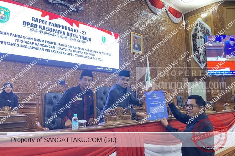SANGATTAKU – Dewan Perwakilan Rakyat Daerah (DPRD) Kabupaten Kutai Timur (Kutim) menggelar Rapat Paripurna ke-27 terkait Penyampaian Pandangan Umum (Pandum) Fraksi-Fraksi DPRD terhadap Rancangan Peraturan Daerah (Raperda) Pertanggungjawaban Pelaksanaan Anggaran Pendapatan dan Belanja Daerah (APBD) Tahun Anggaran (TA) 2023.