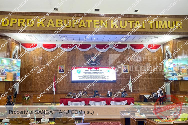 SANGATTAKU – Dewan Perwakilan Rakyat Daerah (DPRD) Kabupaten Kutai Timur (Kutim) menyelenggarakan Rapat Paripurna ke-28, Masa Persidangan III Tahun Sidang 2023/2024, yang membahas tanggapan pemerintah terhadap Pandangan Umum (Pandum) Fraksi-Fraksi DPRD Kutim terkait Rancangan Peraturan Daerah (Raperda) Pertanggungjawaban Pelaksanaan Anggaran Pendapatan dan Belanja Daerah (APBD) Tahun Anggaran 2023.