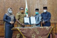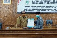 Penandatanganan dilakukan Ketua DPRD Kutim Joni dan Wakil Bupati Kutim Kasmidi Bulang, pada Rapat Paripurna ke 50 tahun 2021, yang dihelat di ruang Sidang Utama, Sekretariat DPRD Kutim, Selasa (23/11/2021).